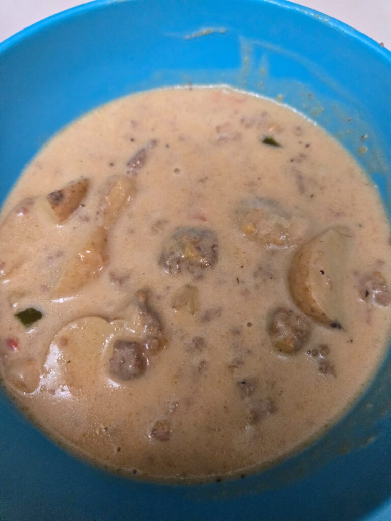 5. Slowly whisk in the beef broth. Add the half and half, mustard, potatoes, and cooked beef.